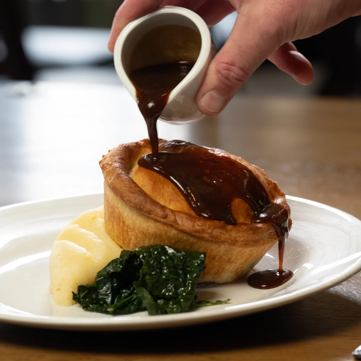 Yorkshire puddings soak without sogginess, batter risen high. These elements unify plates, diners mixing freely.